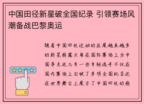 中国田径新星破全国纪录 引领赛场风潮备战巴黎奥运
