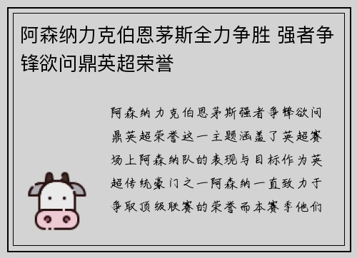 阿森纳力克伯恩茅斯,强者争锋欲问鼎英超荣誉,这一主题涵盖了英超赛场上阿森纳队的表现与目标。作为英超传统豪门之一,阿森纳一直致力于争取顶级联赛的荣誉,而本赛季他们显然已经全力以赴,力争重回巅峰。在与伯恩...